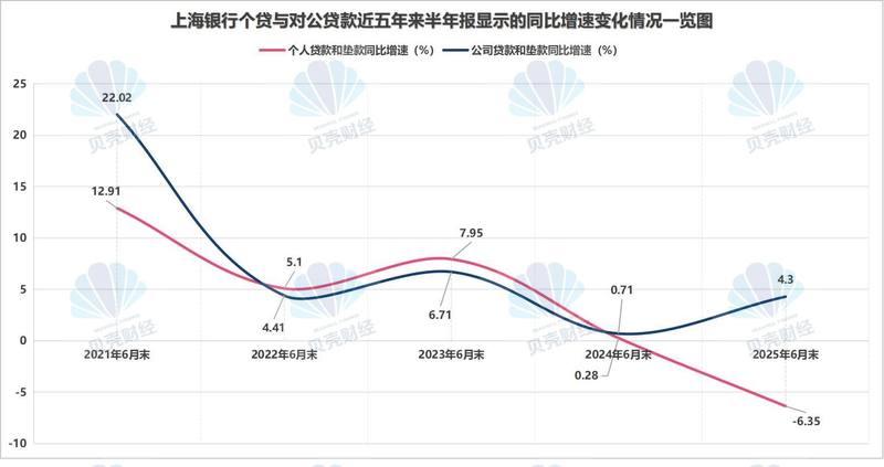 记者查询上海银行近五年半年报同期数据看到,不同于对公贷款,该行零售个贷同比增速呈现下降趋势。截至2025年6月末时,上海银行零售个贷部分同比增速已至-6.35%。即与近五年同期数据相比,该行个贷增速首次进入负增长通道。