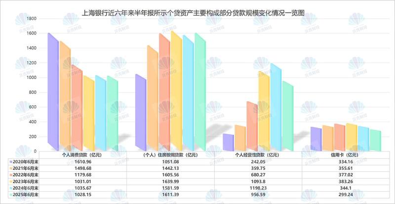 具体到个贷领域,在2025年半年报中,除(个人)住房按揭贷款实现增长外,上海银行在个人消费贷款、个人经营贷款以及信用卡贷款规模上,均呈现出同比降速的情况;特别是上海银行的个人经营贷款与信贷卡业务,其贷款规模在2025年上半年分别跌破1000亿元与300亿元这两个整数关口。