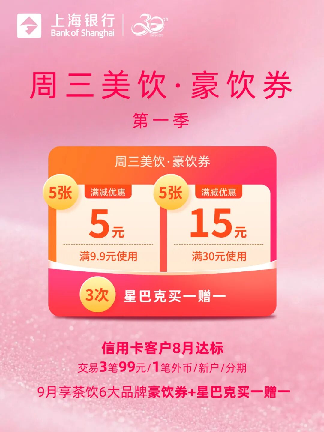 9月至10月,“豪饮券”作为重磅权益正式上线。持卡人完成指定达标任务后,除可继续参与星巴克买一赠一经典活动外,更有机会领取10张多品牌饮品通用券。此前,在饮品消费旺季中,许多用户已逐渐养成使用上海银行信用卡“喝一杯”的消费习惯。此时推出更具吸引力的“豪饮券”,将进一步激发用户为获取超值权益而主动完成消费或分期等任务的意愿,实现“以小带大”撬动更大规模消费的乘数效应。