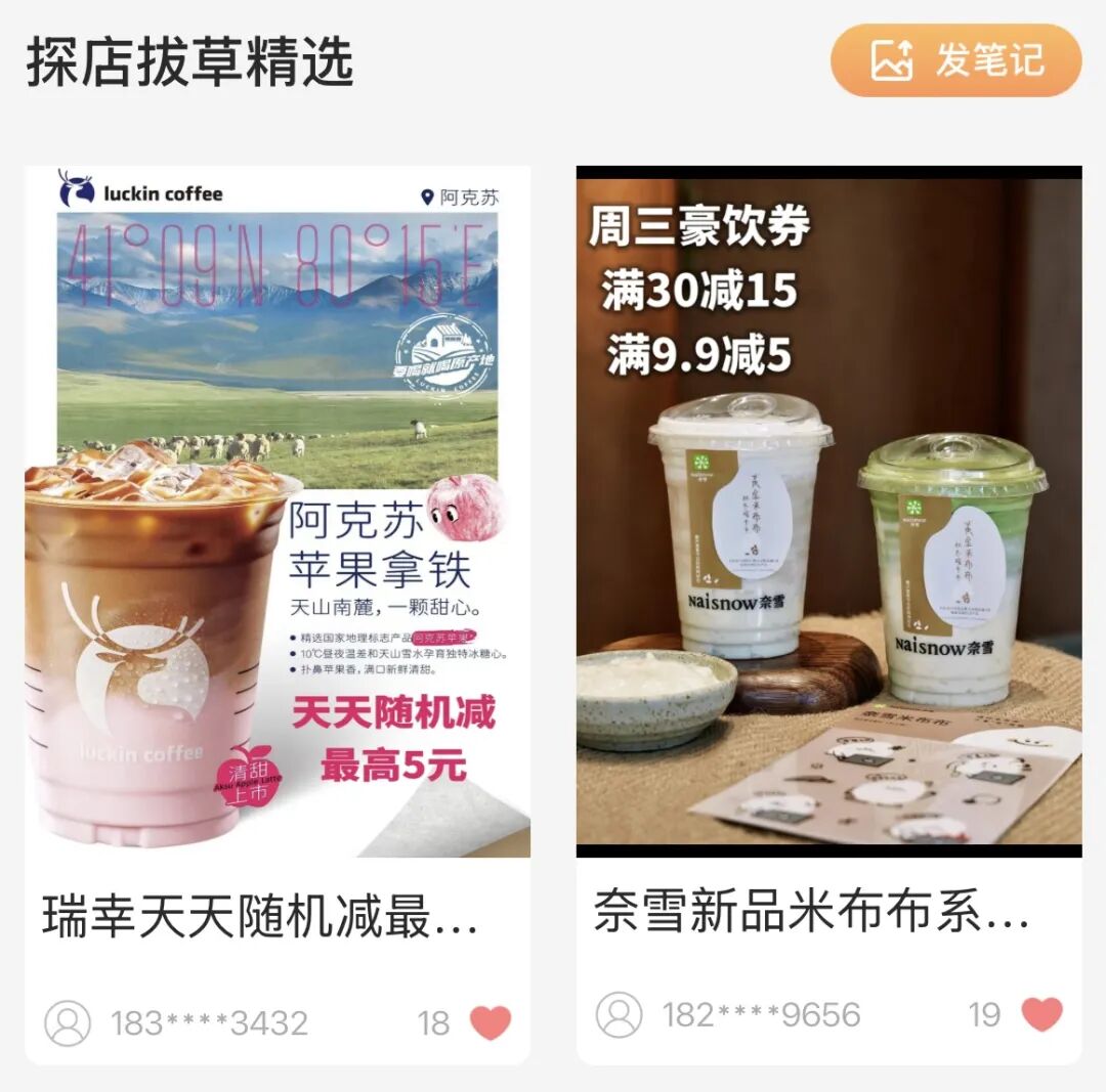 除了豪饮券的领取外,特惠商户频道还会整合饮品品牌新品上市、IP联名爆款等信息,以“活动日历”、“探店种草笔记”、“周边抽奖”等多种形式,持续提供新鲜讯息和购买感受,既“新鲜”又“惊喜”,契合当下消费者追求品质生活、社交分享及情感满足的附属价值。如:向持卡人推荐白桃气泡美式以及风靡亚洲但在国内首次上市的星巴克人气尖货——焙茶拿铁;发布奈雪米布布系列、瑞幸阿克苏苹果拿铁等探店笔记,共推新品。