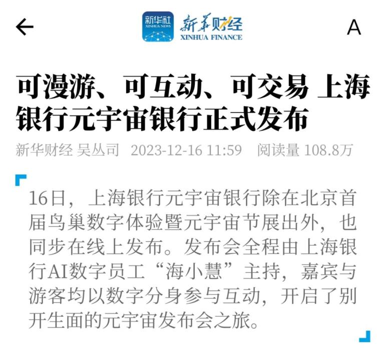 作为当前我行渠道创新的“概念款”,元宇宙银行展示了未来服务的形态:更可视化、更互动、更趣味,让我们“离生态更近,跟用户更亲”。对我们而言,这并非是技术炫技,而是一个承诺:无论世界如何变化,科技如何演进, 上海银行 的服务都将一如既往地智慧而专业、无界而有温度。它探索的不是即时业务,而是我们与下一代客户在未来五年、十年甚至更远处建立联系的深远可能。