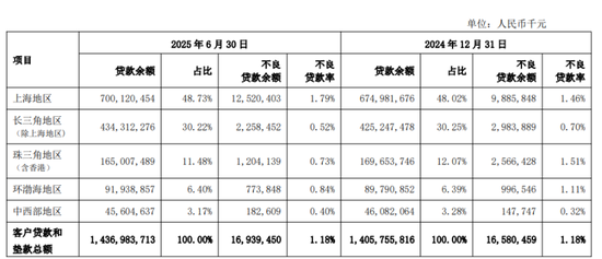 而上海地区受个案风险暴露影响,不良贷款率有所上升,从2024年底的1.46%上升至2025年6月底的1.79%。