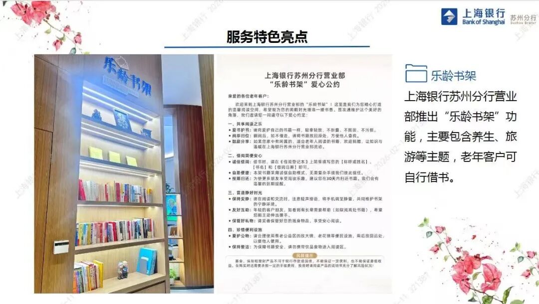 专属空间精准赋能:打造集业务咨询、休息等候、便民服务于一体的养老金融服务专区,内嵌“乐龄书架”与茶歇区,精选养生、旅游等老年群体喜爱的书籍,倡导“爱书护书、共享阅读”的爱心公约,实现金融服务与生活关怀的有机融合。