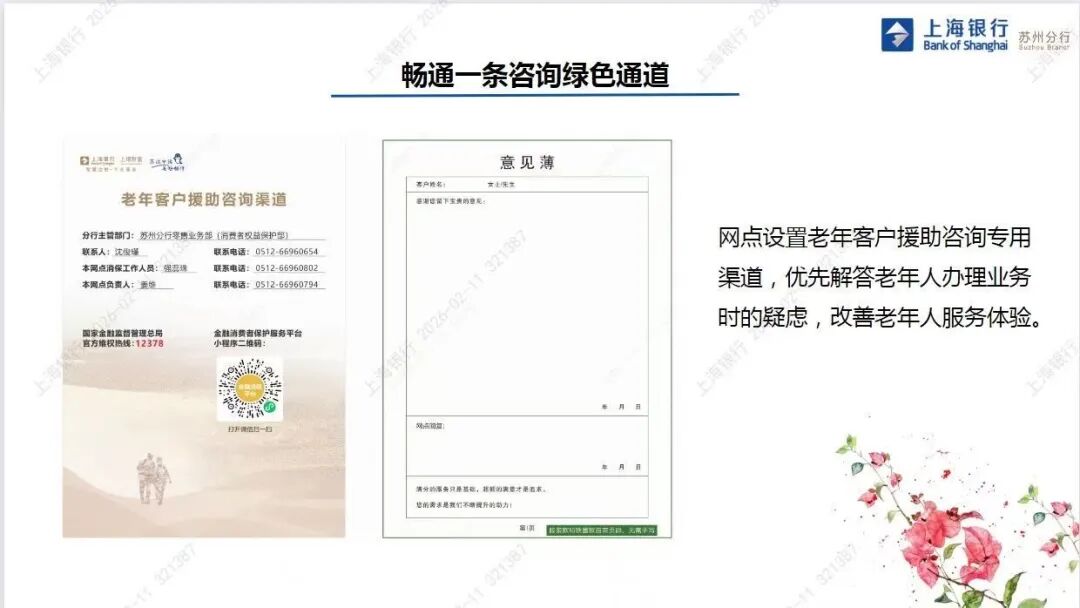 咨询渠道畅通无阻:苏州分行设立老年客户援助咨询专用渠道,安排专人优先解答长者业务疑虑、协助办理各项手续;同步优化服务响应机制,确保老年客户的咨询诉求得到及时、专业的反馈,持续改善服务体验。