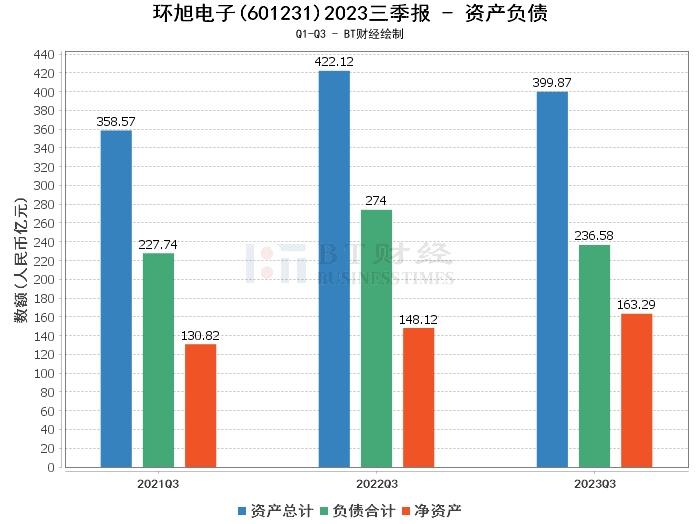 从资产负债方面来看,环旭电子2023年三季度末的总资产为399.87亿元,相比上年度末的385.74亿元增长了3.66%。负债合计为236.58亿元,相比上年度末的228.25亿元增长了3.64%。净资产为163.29亿元,相比上年度末的157.5亿元增长了3.68%。资产负债率为59.16%,与上年度末的59.17%相比基本持平。