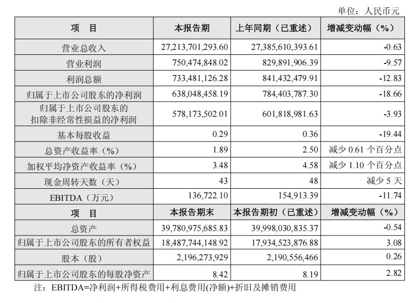 公司实现归属于上市公司股东的净利润6.38亿元,较2024年上半年的7.84亿元减少18.66%;扣除非经常性损益的净利润为5.78亿元,较2024年上半年的6.02亿元同比减少0.24亿元,同比减少3.93%;