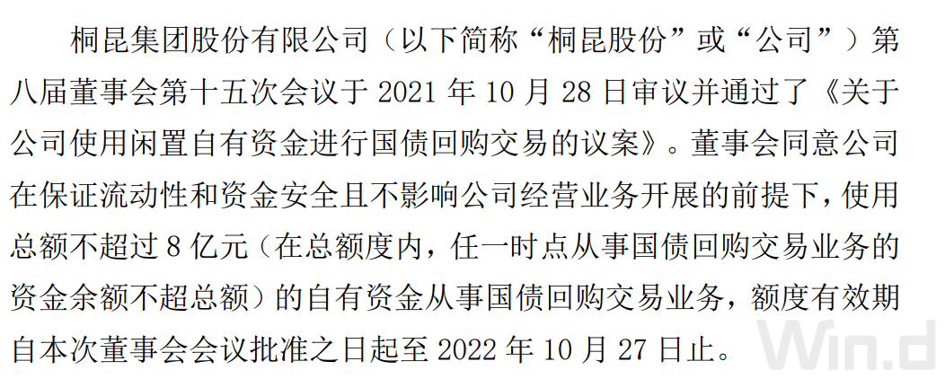 图2:桐昆股份关于使用闲置自有资金进行国债回购交易的公告
