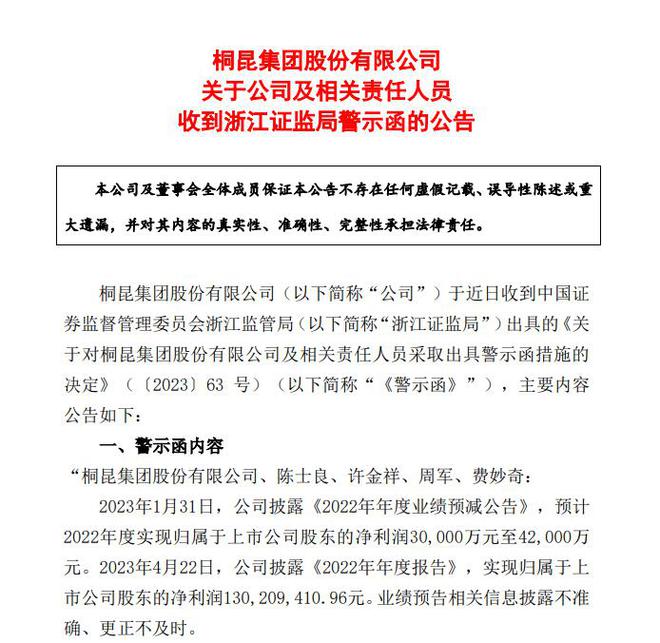 《警示函》显示,2023年1月31日,桐昆股份披露《2022年年度业绩预减公告》,预计2022年度实现归属于上市公司股东的净利润30000万元至42000万元。2023年4月22日,公司披露《2022年年度报告》,实现归属于上市公司股东的净利润130209410.96元。业绩预告相关信息披露不准确、更正不及时。