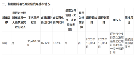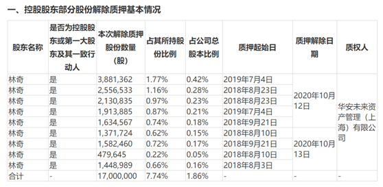 从过往公告内容来看,以2020年10月17日时点来看,彼时,林奇累计质押的股份为1.72亿股,占其所持股份比例的78.18%,占公司总股本的18.76%,对应融资金额11.67亿元,需要在未来一年内还清。