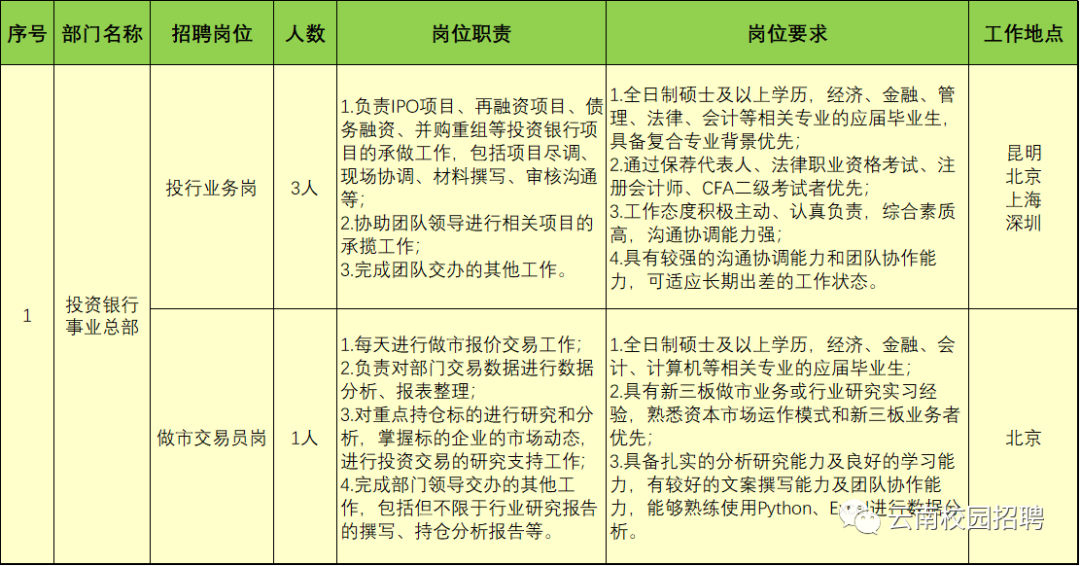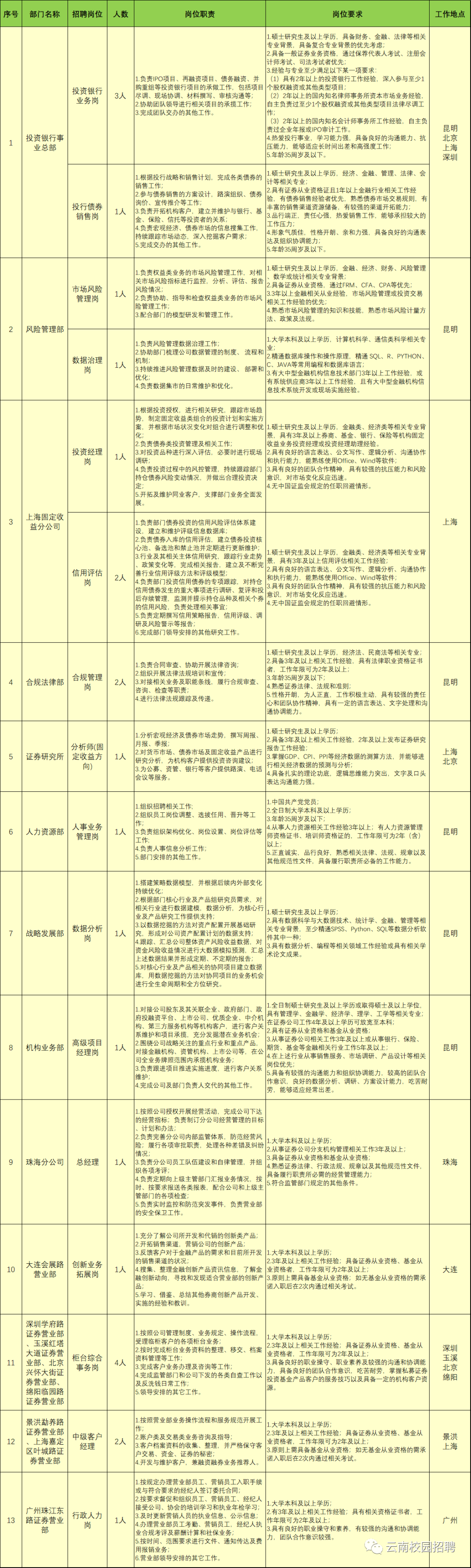 投资银行事业总部8人,风险管理部2人,上海固定收益分公司3人,合规法律部2人,证券研究所1人,人力资源部1人,战略发展部1人,机构业务部1人,珠海分公司1人,大连会展路营业部1人,深圳学府路证券营业部1人,玉溪红塔大道证券营业部1人,北京兴怀大街证券营业部1人,绵阳临园路证券营业部1人,景洪勐养路证券营业部1人,上海嘉定区叶城路证券营业部1人,广州珠江东路证券营业部1人。