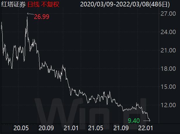 《投资时报》研究员注意到,红塔证券限售股首次解禁后不久,该公司股价自2020年7月15日起便开启了震荡下行的走势,截至今年3月8日收盘已遭腰斩,累计下跌59.91%,居A股上市券商同期跌幅第三。今年以来短短的41个交易日(截至3月8日),该公司股价便下跌了21.14%。