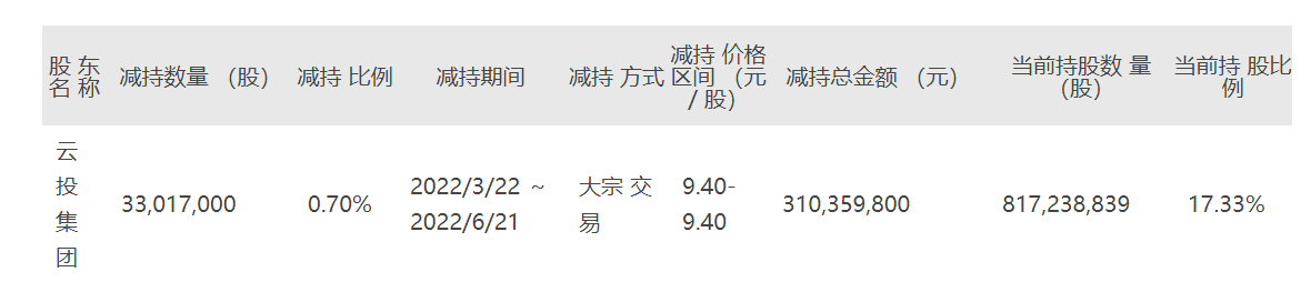 近日,红塔证券收到云投集团《减持进展的告知函》。截至此次公告披露日,云投集团通过大宗交易方式于2022/3/22 到2022/6/21期间累计减持了红塔证券股份3301.7万股,占红塔证券股本总数的0.70%,减持金额合计3.1亿元。