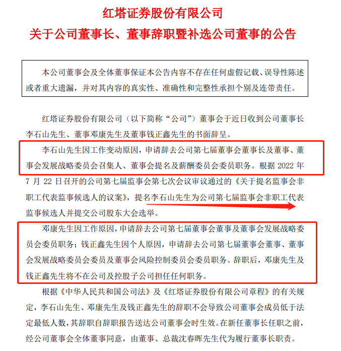 今年7月22日,红塔证券宣布4名高管离职,董事长李石山因工作变动辞去董事长及董事等职务,自8月18日起正式履行该公司监事、监事会主席职责;董事邓康也由于工作原因,辞去董事及董事会发展战略委员会委员职务;董事钱正鑫因个人原因,辞去董事等职务,邓康、钱正鑫均不再担任公司及控股子公司任何职务。此外,红塔证券监事方泽亮因工作原因辞去监事职务,不再担任公司及控股子公司任何职务。