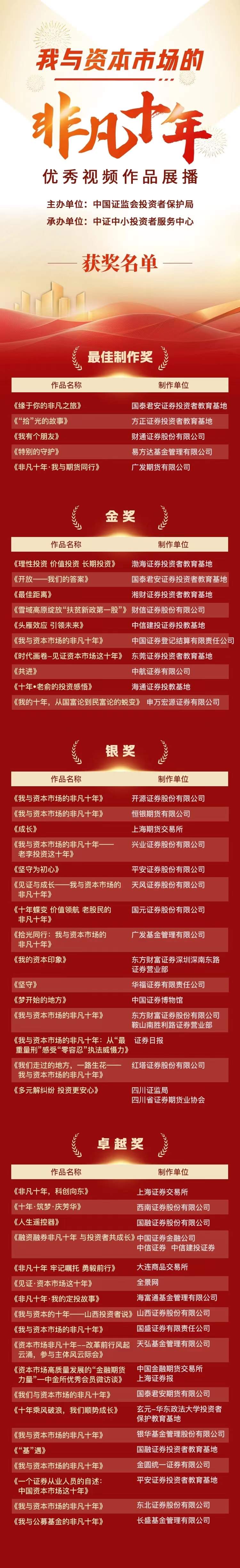经过1个多月的激烈角逐,红塔证券作品《我们走过的地方,一路生花——我与资本市场的非凡十年》从400余件参评作品中脱颖而出,荣获“我与资本市场的非凡十年”优秀视频作品展播银奖!