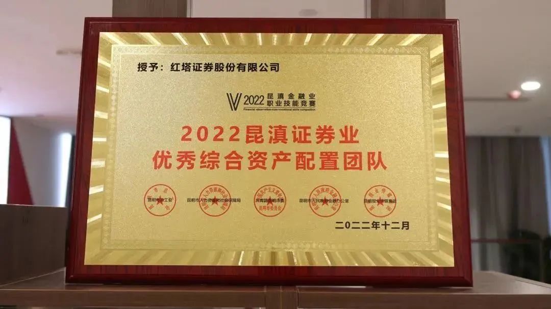 在强手如林的技能竞赛中,红塔证券参赛团队凭借精湛的专业技能、出色的业务服务能力以及竞赛中卓越的团队表现载誉而归,荣获“2022昆滇证券业优秀综合资产配置团队”奖。