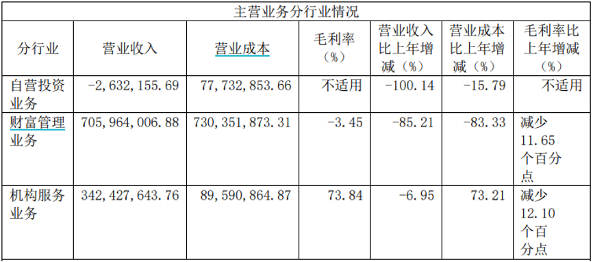 分业务来看,2022年红塔证券实现自营投资业务收入-263.22万元,同比下降100.14%;财富管理业务收入7.06亿元,同比下降85.21%;机构服务业务收入3.42亿元,同比下降6.95%。其中,财富管理业务的毛利率为-3.45%,同比减少11.65个百分点;机构服务业务的毛利率为73.84%,同比减少12.1个百分点。