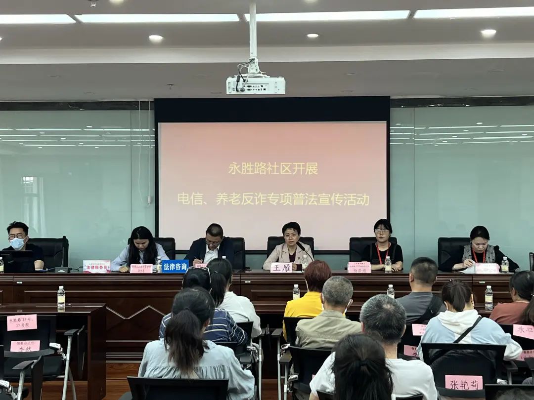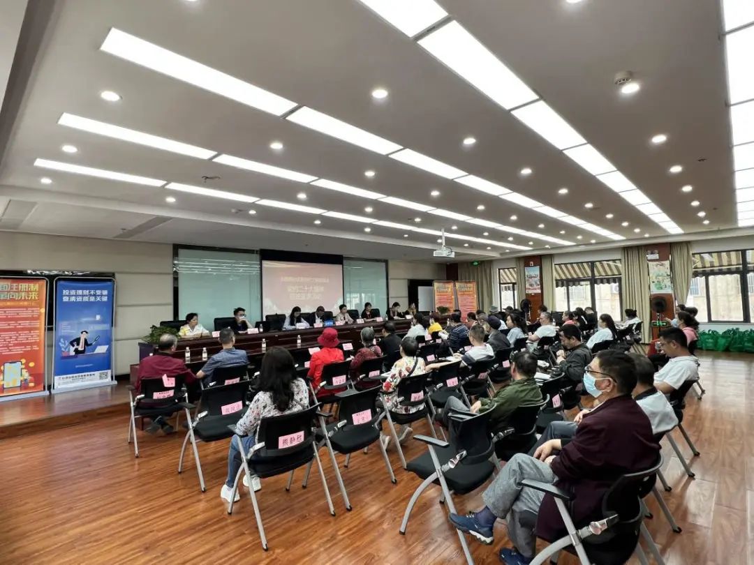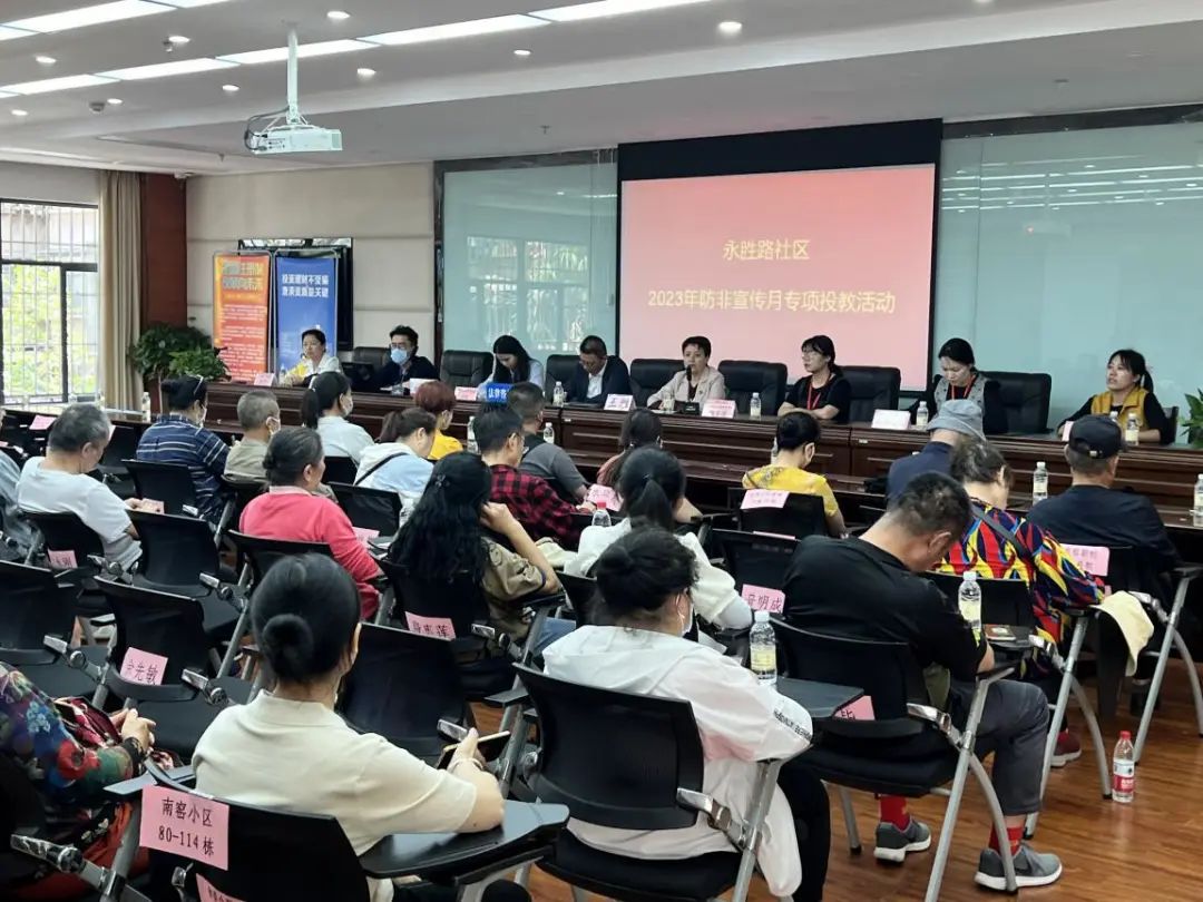 红塔证券投教基地联合永胜路社区在2023年5月18日下午召集辖区14个物委会成员、小区物业、社区网格长等共计50余人在红塔证券投教基地共同开展了防非宣传月及专项普法活动。