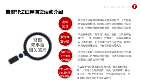 第三部分徐老师介绍了典型非法证券期货活动案例。徐老师讲解了几个典型的非法证券期货活动的案例,如“撮合网”场外配资案、“股轩堂”非法荐股案、股市黑嘴与牛散案、非法发行股票案、外盘期货骗局案、场外个股期权案、非法经营境外期货案、伪私募案和伪“元宇宙”案等。徐老师详细介绍了以上案件的梗概,分析了违法过程与相关法规,提醒了投资者非法证券期货相关案例的风险与防范要点。