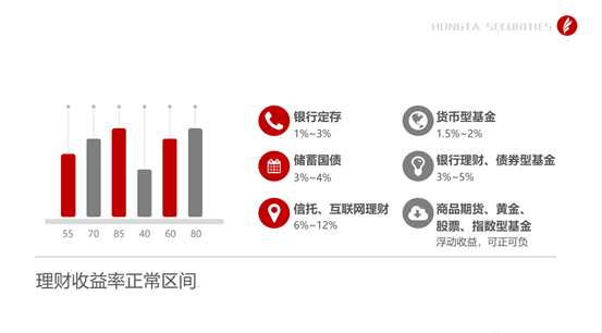 第一部分徐老师介绍了如何辨识投资合理收益区间。首先,各种理财产品都有其合理的收益区间,如银行定存是1%~3%、货币型基金是1.5%~2%、储蓄国债是3%~4%等。其次,辨别合理投资收益时需对标两个标准:一是对标GDP增速。投资产品时,辨明投资方向可有效辨别该产品所投资行业、方向是否能够领跑国家、省份GDP增速。二是对标15.4%。国家对存贷利率的标准红线为15.4%,超过此利率,即使存贷双方签订了协议,法律上也不予承认。