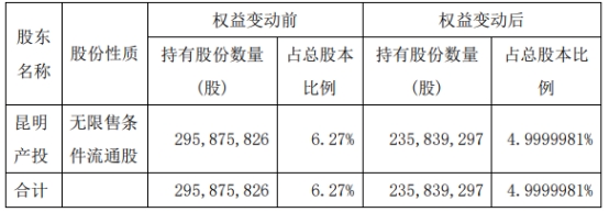 本次权益变动后,昆明产投持有红塔证券股份数量为2.36亿股,持股比例为4.9999981%。