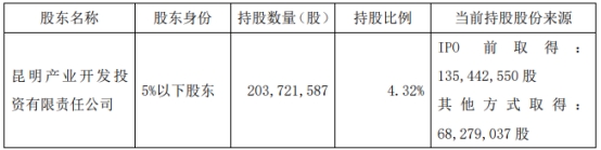 截至2023年8月9日,昆明产投持有红塔证券无限售条件流通股203,721,587股,占公司总股本比例为4.32%,前述股份来源分别为公司首次公开发行股票并上市前持有的股份135,442,550股以及公司配股公开发行证券获配股份68,279,037股。其中,昆明产投持有的公司首次公开发行前股票于2020年7月6日起上市流通,其持有的配股公开发行证券获配股份于2021年8月25日起上市流通。