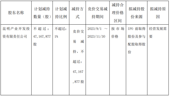 8月11日讯昨日晚间,红塔证券(601236.SH)发布股东集中竞价减持股份计划公告。昆明产业开发投资有限责任公司(以下简称“昆明产投”)因经营发展需要,拟自2023年9月1日至2023年11月30日通过集中竞价方式减持股份总数不超过47,167,877股,占公司股份总数不超过1.00%。