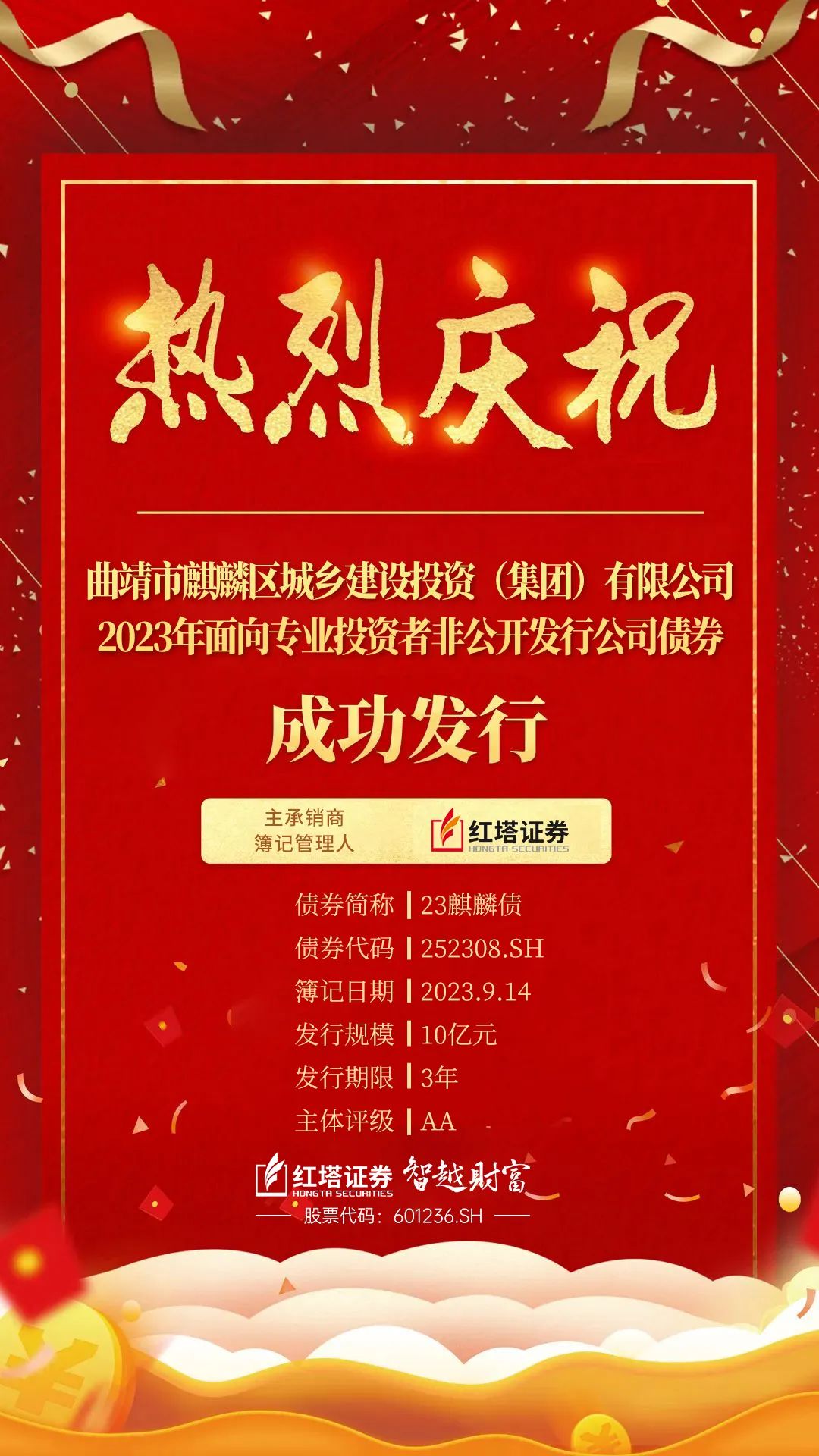 2023年9月15日,由红塔证券担任主承销商的曲靖市麒麟区城乡建设投资(集团)有限公司2023年面向专业投资者非公开发行公司债券在上交所成功发行。本期债券发行人麒麟城乡投是曲靖市麒麟区的核心国企,在麒麟区的基础设施建设、乡村持续振兴及社会经济发展等重大领域多有建树。红塔证券立足云南省域,积极领会省政府的“扎实做好防风化债各项工作”的会议精神,以中央及各级监管部门的政策为向导,坚守“统筹协调金融支持地方债务风险化解”的初心使命,充分利用资本市场筹募资金,为麒麟城乡投通过借新还旧化解存量债券到期的流动性风险,有效维护麒麟区内的信用环境。