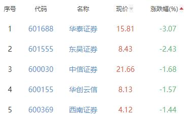 华泰证券、东吴证券、中信证券、华创云信、西南证券位列涨幅榜后五位,涨幅分别为-3.07%、-2.43%、-1.68%、-1.57%、-1.44%。