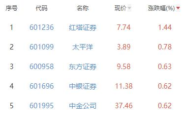 其中,红塔证券、太平洋、东方证券、中银证券、中金公司位列板块涨幅前五位,涨幅分别为1.44%、0.78%、0.63%、0.62%、0.62%。
