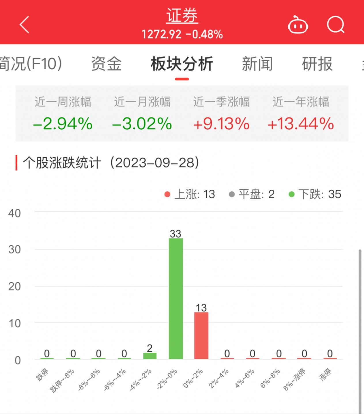 今日,证券板块整体跌幅0.48%,其中13只股票上涨,2只股票平盘,35只股票下跌。