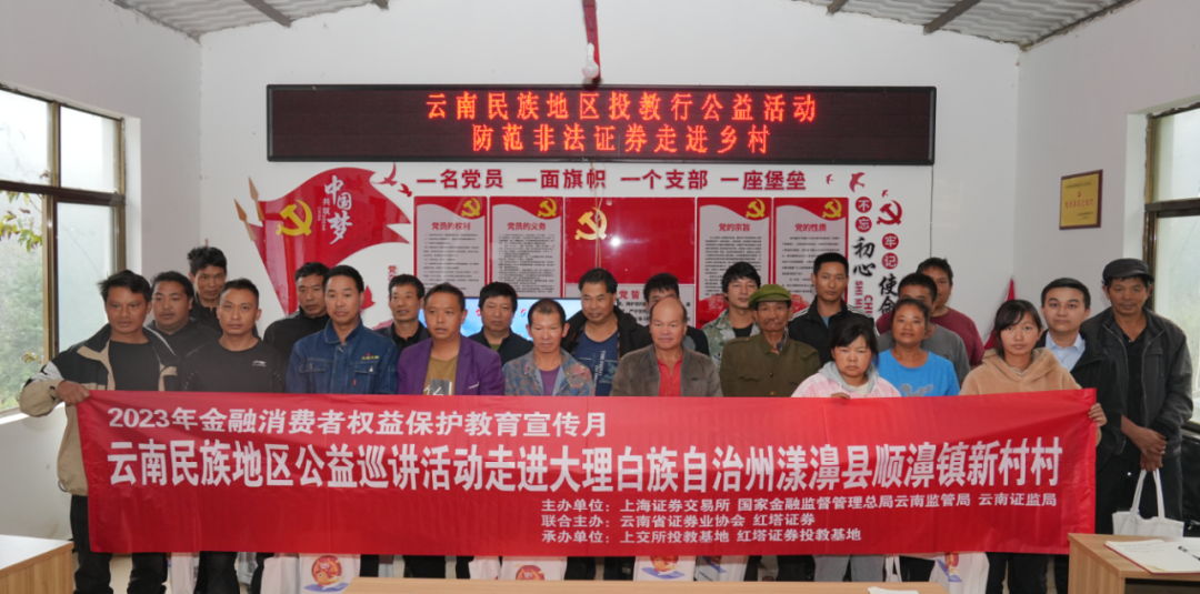 云南作为祖国西南边陲,具有多民族、多村寨的特点,金融知识和理财意识较为短缺、信息较为滞后。为积极响应中国证券业协会有关证券行业促进乡村振兴公益行动号召,红塔证券通过践行乡村振兴战略与投资者教育工作相结合的工作模式,力求将“扶贫先扶志,扶贫必扶智”工作精神踏踏实实深入落实到云南民族地区村寨,为防范返贫复贫贡献一份力量。2023年10月12日上午,上交所、红塔证券走进大理白族自治州漾濞县顺濞镇新村村,为当地村民带来公益巡讲活动。