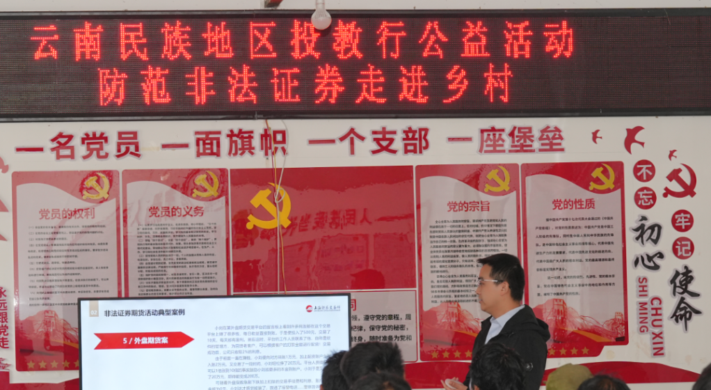 上海证券交易所投资者服务部高级经理李翔为村民带来了《防范非法证券》主题分享。通过李翔老师的分享,让当地村民了解了非法证券活动的手段多样化,学习遇到非法集资、金融诈骗应该如何辨别,防止上当受骗。