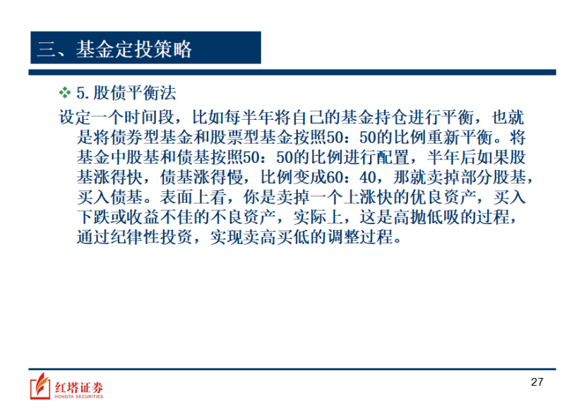第二部分,讲师介绍了基金定投的策略和方法,包括:定时定额定投法、定时不定额定投法、不定时不定额定投法、均线偏离法、股债平衡法。在固定的时间定投固定数额的资金,叫“定时定额定投法”,这是最为基本的定投操作。目前,很多基金购买平台都推出了智能定投,也就是固定的时间进行定投。但是根据一定的标准,“高了少卖,低了多买”,实现“同样资金积累更多基金份额”的目的,称为“定时不定额定投法”。