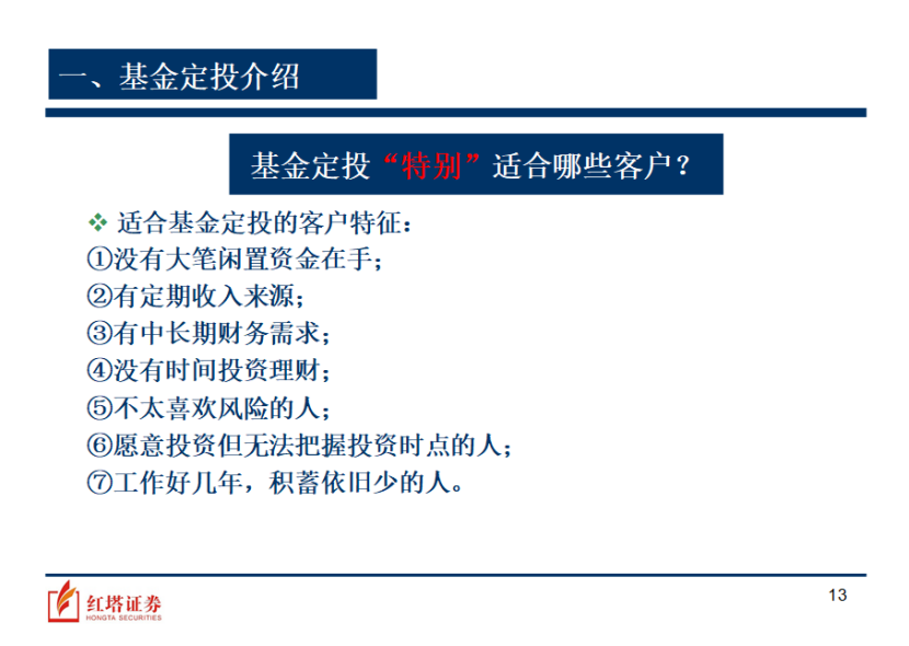 首先,申晔老师介绍了基金定投的概念,基金定投是投资者委托基金销售机构,由受托机构在每月约定时间从投资者指定的资金账户上自动完成约定金额的扣款,自动申购约定基金产品的一种长期投资方式。基金定投是进行长期投资然后通过复利获益的一种投资手段,投资门槛低能满足普通投资者需求;自动扣款省心省力;平均投资和定期投资可以分散风险摊薄成本。