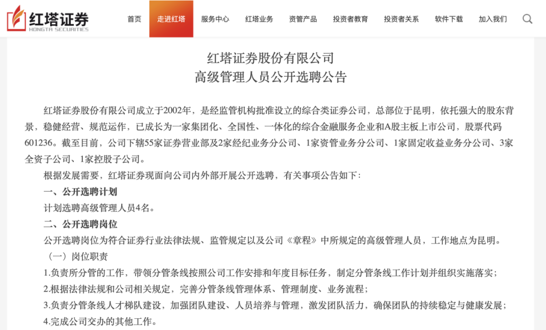 9月22日,红塔证券发布公告,面向公司内外部公开选聘4名高级管理人员,涉及副总裁、首席信息官(CIO)、董事会秘书三个职位。