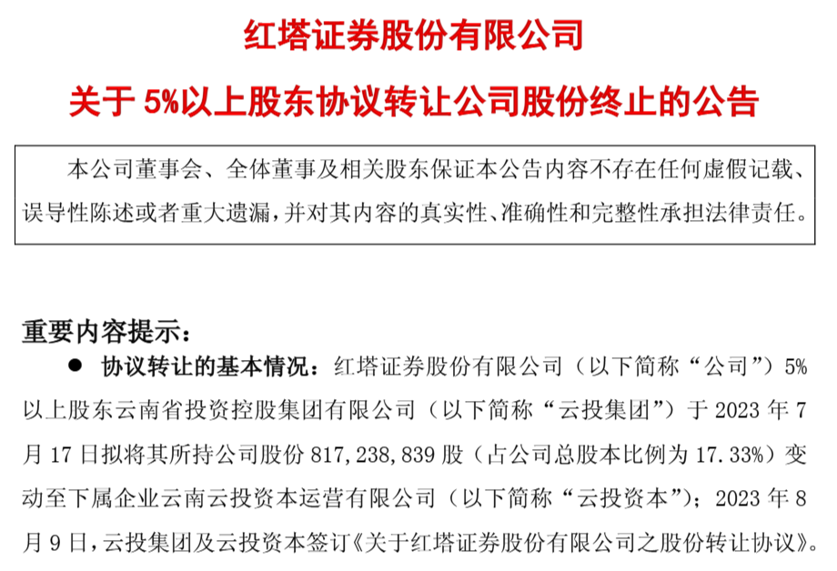 2023年8月,红塔证券公告称,云投集团拟将持有的8.17亿股股份(占公司总股本的17.33%)转让给下属企业云投资本,协议于2023年8月9日签署。