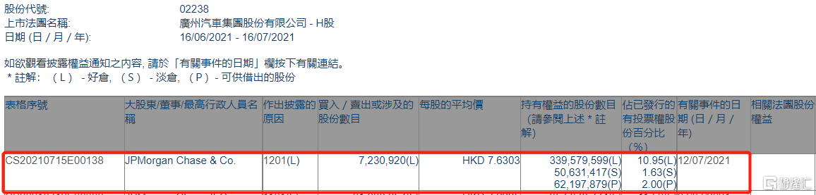 格隆汇APP获悉,根据联交所最新权益披露资料显示,2021年7月12日,广汽集团(02238.HK)遭JPMorgan Chase & Co.以每股均价7.6303港元减持好仓723.092万股,涉资约5517.4万港元。