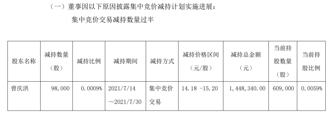 8月4日,广汽集团(601238.SH)发布董事集中竞价减持股份进展公告。董事长曾庆洪于7月14日至7月30日通过集中竞价方式减持9.8万股,减持比例为0.0009%,超计划减持数量的一半。