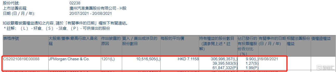 格隆汇APP获悉,根据联交所最新权益披露资料显示,2021年8月16日,广汽集团(02238.HK)遭JPMorgan Chase & Co.以每股均价7.1158港元减持好仓1051.65万股,涉资约7483.33万港元。