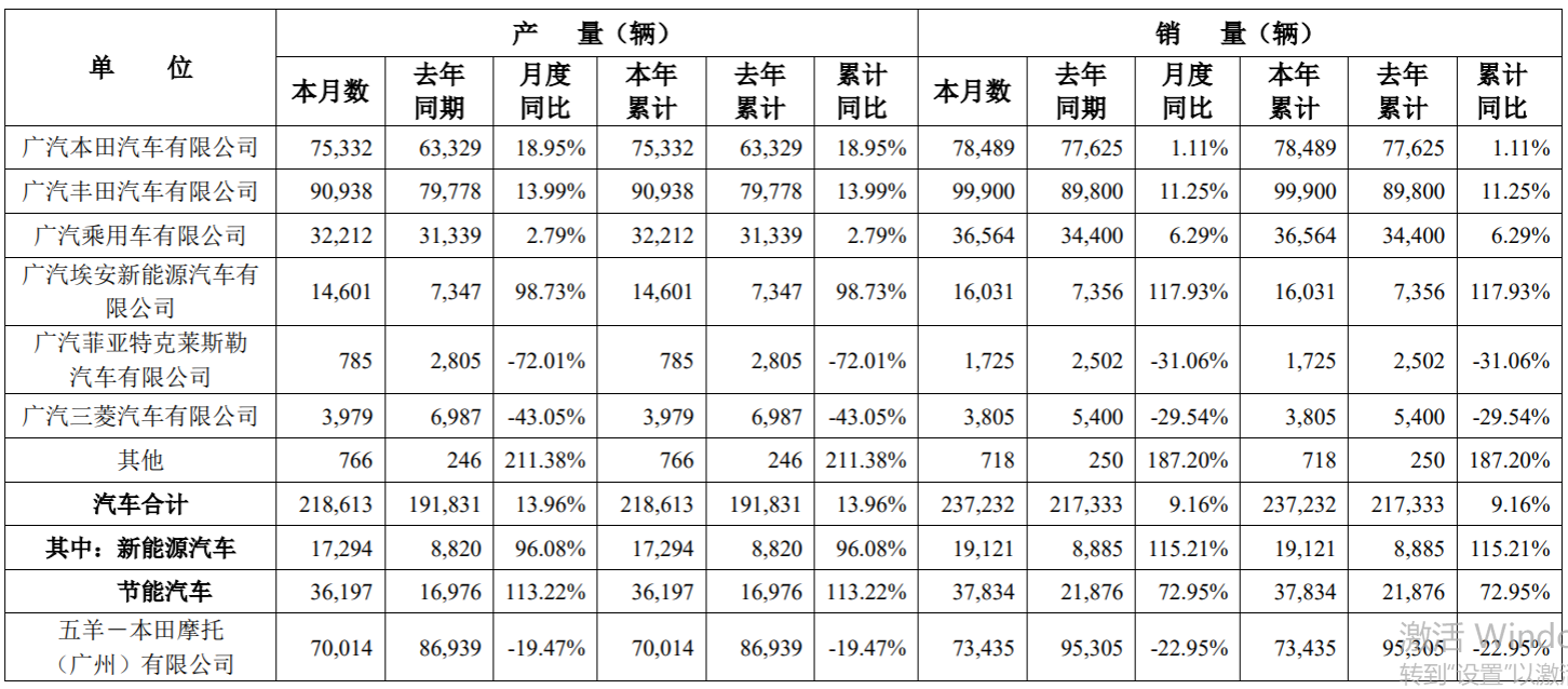 广汽集团1月新能源汽车产量为17294辆,同比增长96.08%;1月新能源汽车销量为19121辆,同比增长115.21%。