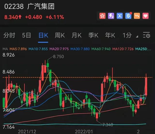 2月9日,广汽集团A股报收14.04元/股,涨幅为3.92%;H股报收8.34元/股,大涨6.11%。