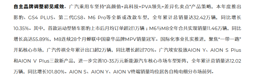 2021年度内,广汽传祺先后推出了影豹、GS4 PLUS、第二代GS8、M6 Pro等多款全新或者改款车型。广汽埃安作为广汽集团自主事业的新能源汽车品牌,在2021年也先后投放了AION Y、AION S PLUS以及AION V PLUS等三款新产品,进一步丰富了AION品牌的产品线。