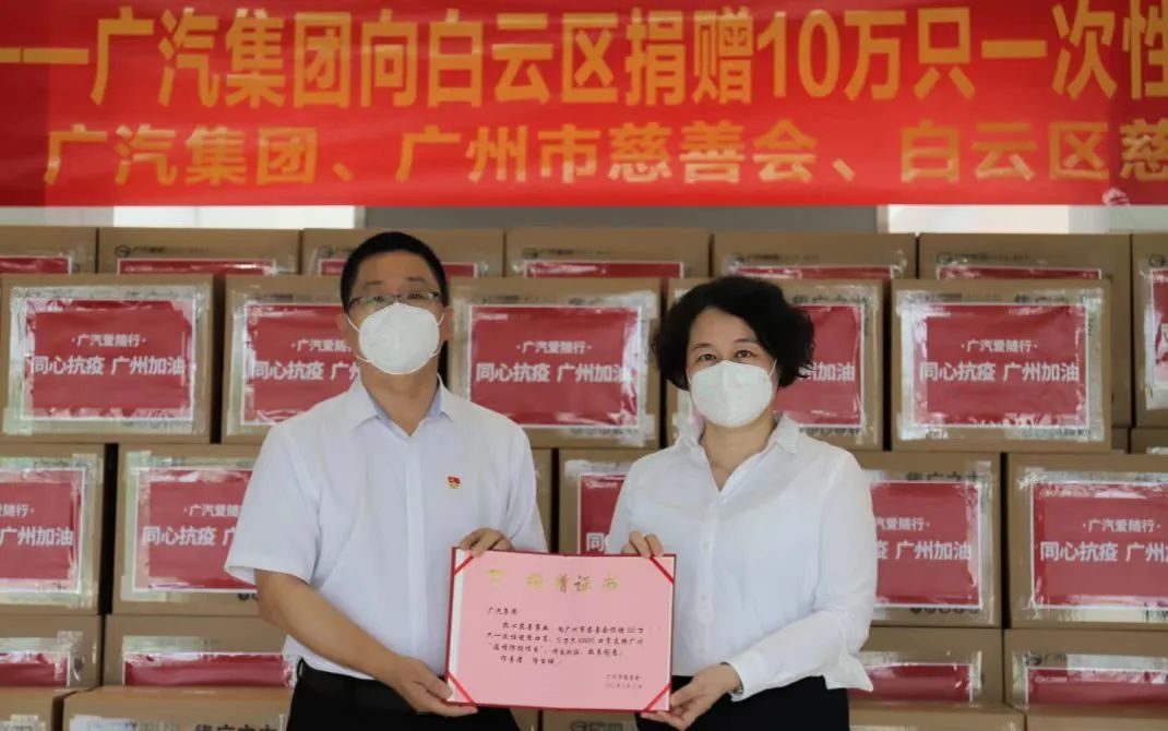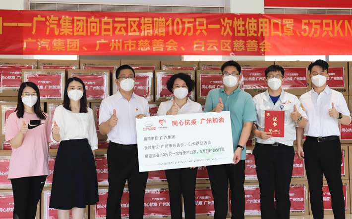 4月15日,广汽集团联合广州市慈善会举行“广汽爱随行——同心抗疫?广州加油”助力广州疫情防控爱心捐赠活动,广汽集团向白云区慈善会捐赠10万只广汽自制一次性口罩和5万只KN95口罩,用于支援白云区新冠肺炎疫情防控工作。广州市慈善会、白云区慈善会、广汽集团代表参加捐赠活动。