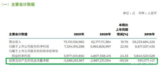 不仅是负增长,而且是负数。2021年该指标为-55.89亿元,相比2020年下滑了93.59%。