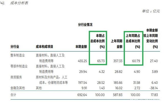 特别是汽车制造方面,作为该集团的主要成本,2021年超455亿元,2020年为357亿元多一点,杠杆游戏要说的,主要不是这个增量,背后和产销有关,我要说的是成本比例的变动。