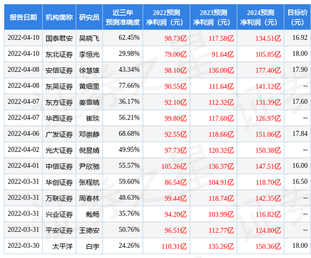 证券之星数据中心根据近三年发布的研报数据计算,东吴证券黄细里研究员团队对该股研究较为深入,近三年预测准确度均值为77.66%,其预测2022年度归属净利润为盈利90.55亿,根据现价换算的预测PE为12.59。
