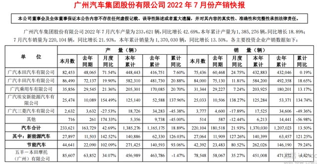 8月4日,广汽集团发布7月份产销快报称,该月汽车合计销量为220104辆,同比增长21.93%,本年累计销量为1370030辆,同比增长13.50%;其中新能源汽车销量为27064辆,同比增长127.26%。