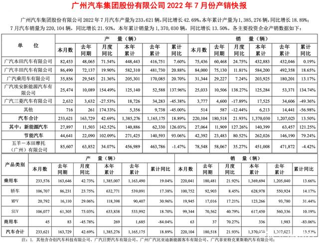 广汽集团近日公布了最新销量业绩,7月销量为220,104辆,同比增长21.93%,年度累计销量为1,370,030辆,同比增长13.5%。其中,以广汽本田和广汽丰田代表的合资板块,年度累计销量为1,017,083辆,同比增长超过10%,而自主板块的广汽传祺和广汽埃安,年度累计销量为329,209辆,同比增长超过40%。