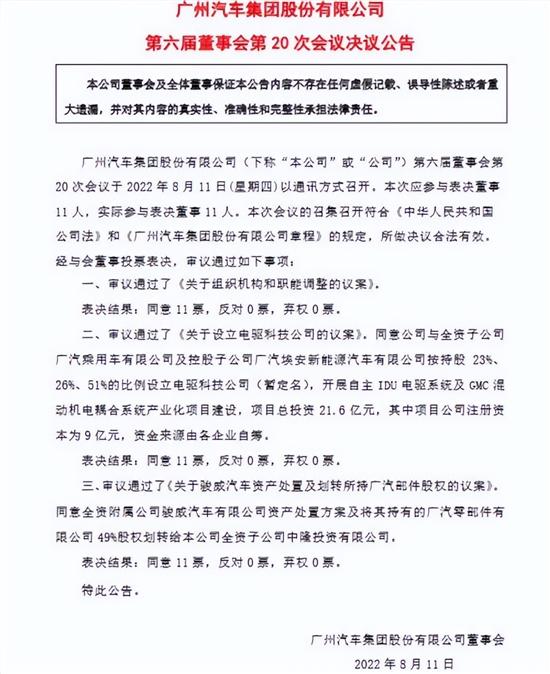 公告显示,广汽集团参与表决董事审议通过的《关于骏威汽车资产处置及划转所持广汽部件股权的议案》,同意全资附属公司骏威汽车有限公司资产处置方案及将其持有的广汽零部件有限公司49%股权划转给公司全资子公司中隆投资有限公司。