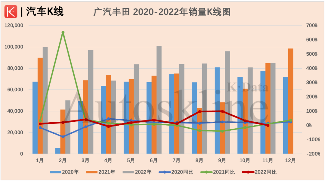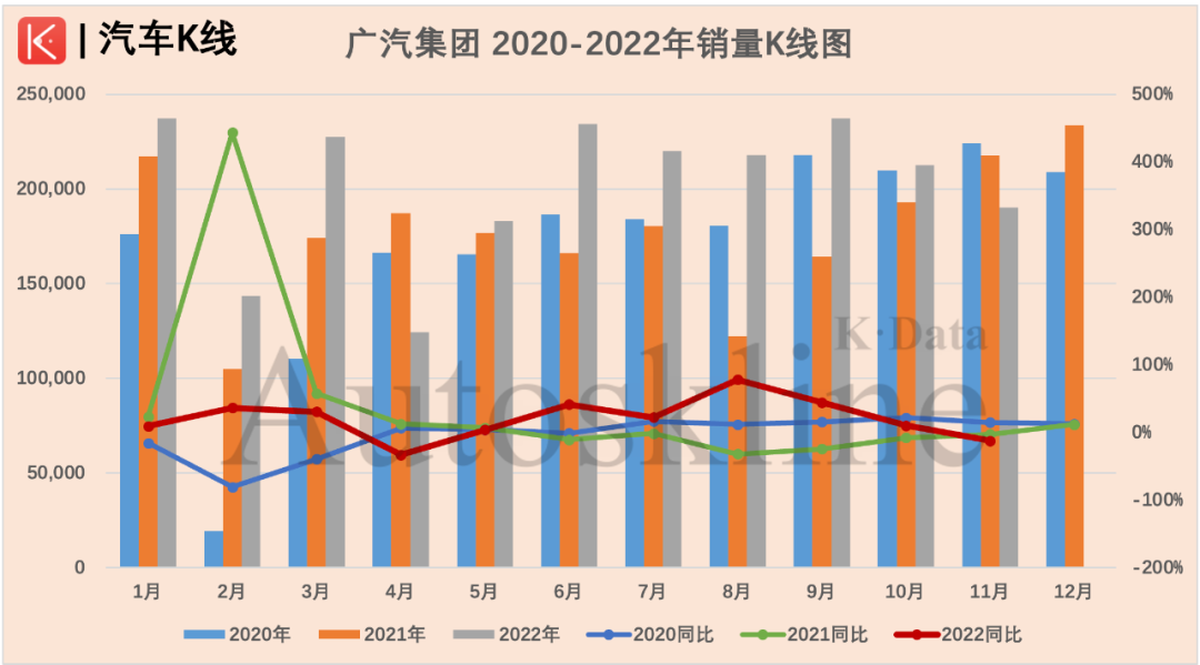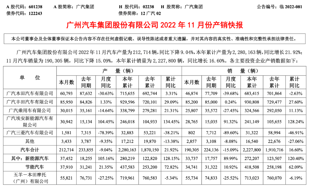 早在11月初,广州市卫健委表示,“广州市正面临抗疫三年以来最复杂、最严峻的疫情。”从整体上看,广汽集团11月生产21.27万辆,同环比分别下降9.04%、9.41%,单月销售19.03万辆,同环比分别下降15.09%、10.43%。对广汽集团整体产销所带来的影响可见一斑。